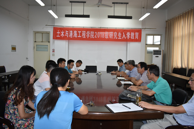 9月12日下午,土木与港海工程学院开展2018级研究生入学教育。学院党政领导吴建新、张三柱、宗钟凌等,研究生导师田安国教授、顾炳伟教授、蒋德稳教授,党政办、教务办、学工办负责人,陈舜禹、赵成昆、胡文硕3名研究生新生与2名老生共同参加,入学教育会议由副院长宗钟凌主持。