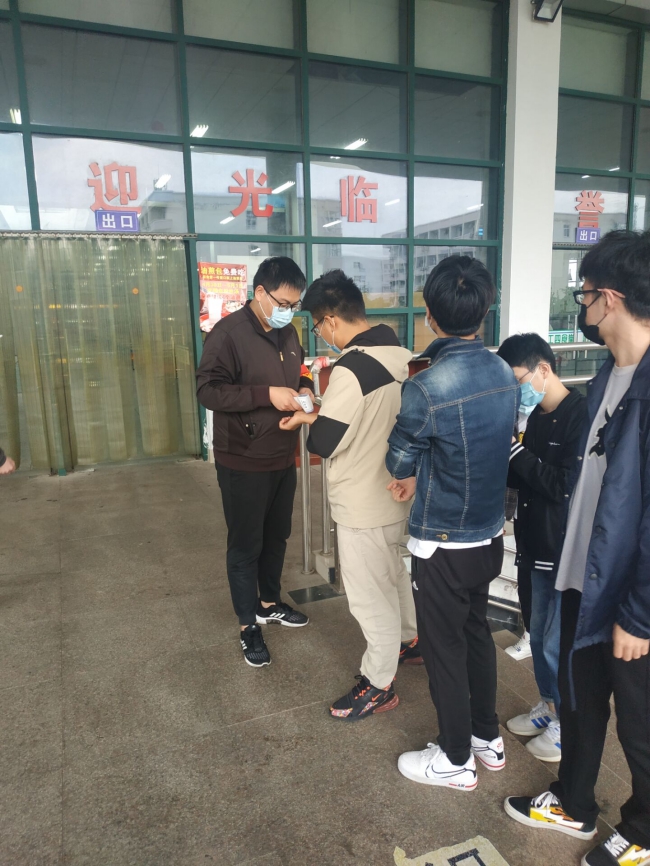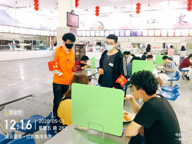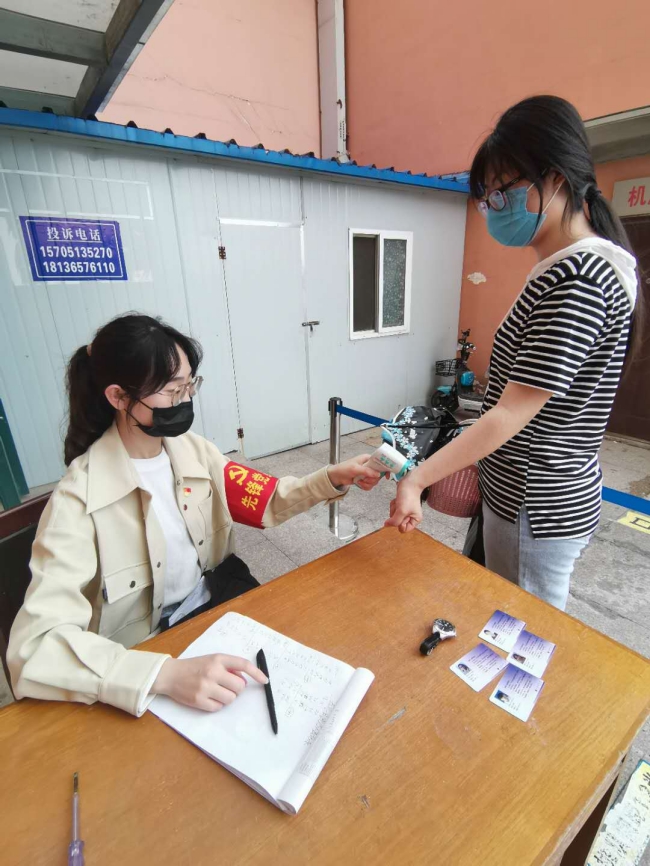 上午9点,集体合影后,党员分队开始对文华楼、文思楼进行巡查,监督教室内是否存在坐在一起学习的情况。对于这种情况的出现,党员志愿者们对相关同学进行劝导,灌输隐患意识,做好疫情防控,为同学们营造一个相对安全且无后顾之忧的学习环境。整个督察过程十分顺利,大多数同学都有佩戴口罩、与人保持适当距离的意识;对于那些坐在一起的同学,在被劝说之后,也都积极配合党员志愿者们的工作。中午12点至下午1点、下午5点至6点,在三食堂和四食堂门口的党员分队,接替了食堂工作人员的工作,在就餐高峰期,对去食堂的同学进行体温检测,同时,在一、二、三、四食堂内部,志愿者们开展巡查工作,监督是否存在面对面就餐的情况。分头行动结束以后,据志愿者们反映,去食堂就餐的同学都能遵守规则、维护秩序,自觉站在食堂门口排队,等待工作人员检测体温;在午餐和晚餐的就餐高峰期,面对面就餐的问题比较突出,考虑时间、空间等多种因素,志愿者们虽予以理解,但是特殊时期,做好防控工作刻不容缓,仍要杜绝一切隐患问题的存在。下午5点30至6点30,两名党员志愿者分别去男女浴室门口,接替叔叔阿姨的工作,在洗澡高峰期,对去浴室的同学进行体温监测和人数记录。看似平凡、简单的工作,背后却是坐在板凳上、日复一日的每天十小时辛苦付出,“能把平凡的事情做好就是不平凡”,从他们身上折射出的是广大劳动群众辛勤工作在各自的平凡岗位上,以实际行动践行劳模精神、劳动精神、工匠精神!