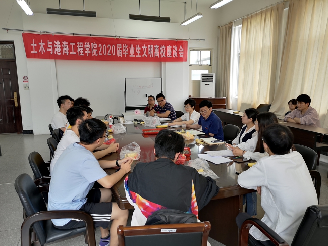 为把毕业生文明离校工作推向深入,关心关注毕业生离校前的思想动态,确保毕业生安全、文明、有序离校。6月10日上午,土木与港海工程学院2020届毕业生文明离校座谈会在学院会议室召开。党委书记尤洪建,副书记钱汉珍,全体辅导员,各毕业班班长、团支书、学习委员等主要学生干部参加座谈。钱汉珍主持座谈会。