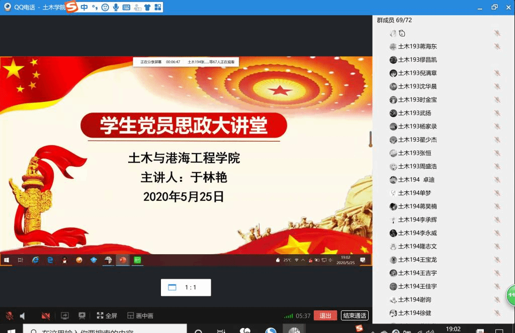 2020年5月25日晚七点,土木与港海工程学院第三期学生党员思政大讲堂通过QQ在线课堂如期举行。此次大讲堂的主题是“认识社会主义核心价值观,充实青春生活”,主讲人为工管172班团支书,中共预备党员于林艳同学。土木193、土木194班全体同学参加聆听。