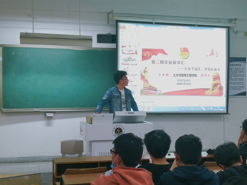 2020年5月11日晚上七点四十,在文通楼322教室,我院成功举办了第二期青春故事汇活动。本期青春故事汇的主题是“青春不迷茫,梦想在前方”,由连云港市优秀共青团干部、建筑171班的团支书吕致平同学主讲,建筑192团支书魏俊主持,建筑学19级全体同学参加。