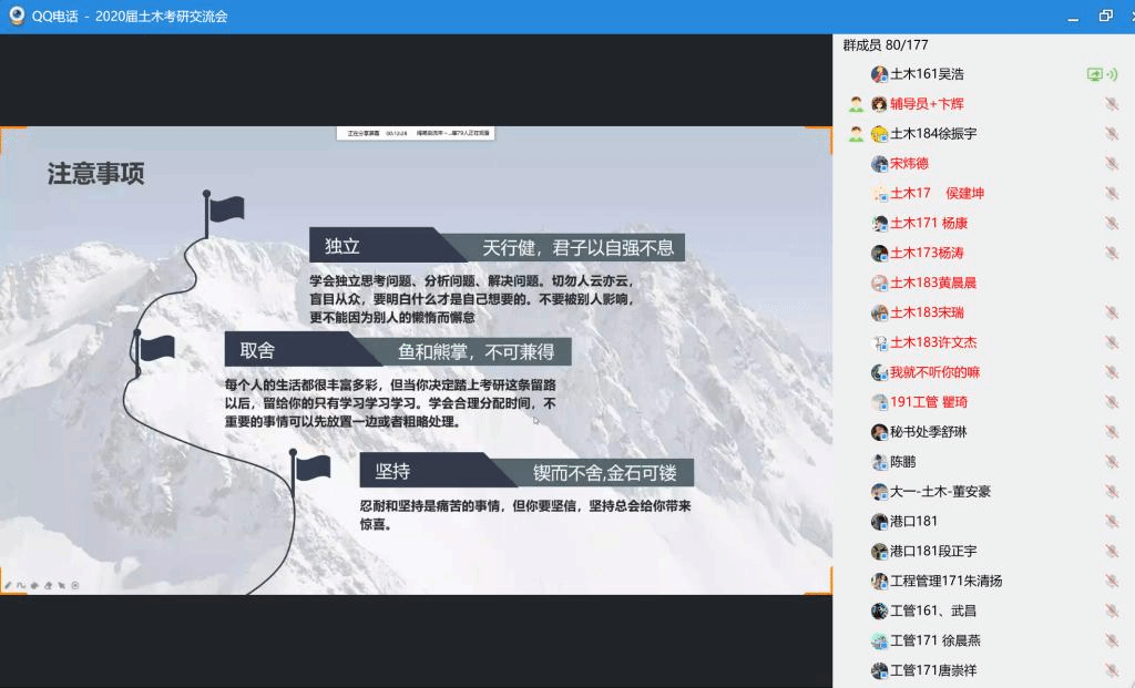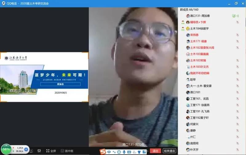 2020年6月17日晚7点30分,2020土木工程专业考研交流会以QQ在线课堂的形式圆满举行。此次考研交流会邀请的主讲有周长春、朱贺、吴浩、褚乐和李方正,他们均是在研究生入学考试中表现优异、成功上岸的同学,参与聆听的同学来自大一到大三中有考研意愿或正在备考的同学。