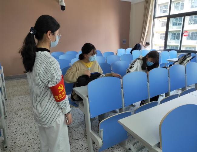 上午9点,集体合影后,党员分队开始对文华楼、文思楼进行巡查,监督教室内是否存在坐在一起学习的情况。对于这种情况的出现,党员志愿者们对相关同学进行劝导,灌输隐患意识,做好疫情防控,为同学们营造一个相对安全且无后顾之忧的学习环境。整个督察过程十分顺利,大多数同学都有佩戴口罩、与人保持适当距离的意识;对于那些坐在一起的同学,在被劝说之后,也都积极配合党员志愿者们的工作。中午12点至下午1点、下午5点至6点,在三食堂和四食堂门口的党员分队,接替了食堂工作人员的工作,在就餐高峰期,对去食堂的同学进行体温检测,同时,在一、二、三、四食堂内部,志愿者们开展巡查工作,监督是否存在面对面就餐的情况。分头行动结束以后,据志愿者们反映,去食堂就餐的同学都能遵守规则、维护秩序,自觉站在食堂门口排队,等待工作人员检测体温;在午餐和晚餐的就餐高峰期,面对面就餐的问题比较突出,考虑时间、空间等多种因素,志愿者们虽予以理解,但是特殊时期,做好防控工作刻不容缓,仍要杜绝一切隐患问题的存在。下午5点30至6点30,两名党员志愿者分别去男女浴室门口,接替叔叔阿姨的工作,在洗澡高峰期,对去浴室的同学进行体温监测和人数记录。看似平凡、简单的工作,背后却是坐在板凳上、日复一日的每天十小时辛苦付出,“能把平凡的事情做好就是不平凡”,从他们身上折射出的是广大劳动群众辛勤工作在各自的平凡岗位上,以实际行动践行劳模精神、劳动精神、工匠精神!