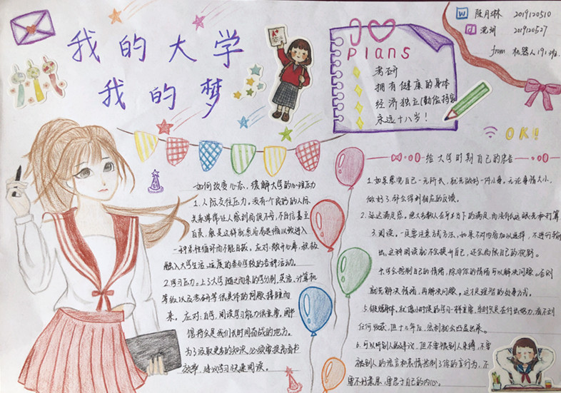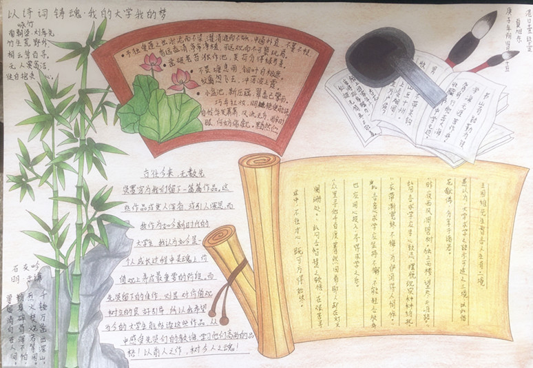 全校同学积极响应号召,利用自己对大学、对梦想的感悟,以手抄报的形式展现出了大学的美好、梦想的美好,表达了当代大学生的心理思想觉悟,以丰富多彩的绘画形式展现了当代大学生梦想的飞扬多彩。本次活动的创作内容表达了当代大学生善于利用大学美好时光,创造梦,追求梦,实现梦的积极向上精神面貌。