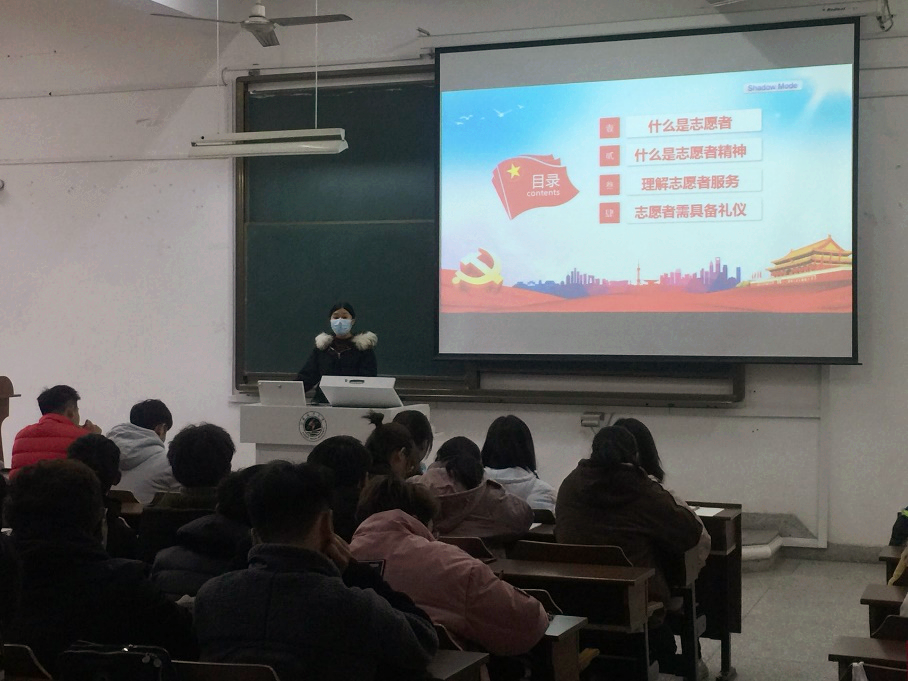 卞老师主要从什么是志愿者、什么是志愿者精神、理解志愿者服务、志愿者要具备的礼仪四个方面进行授课。