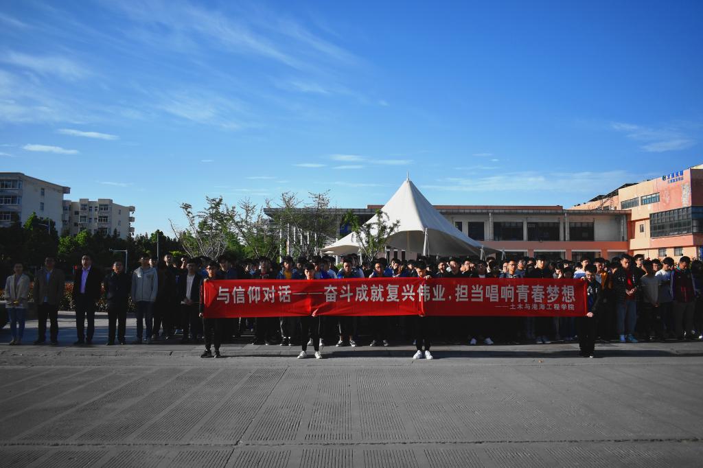 5月20日清晨,土木与港海工程学院“奋斗成就复兴伟业,担当唱响青春梦想”主题升旗仪式在苍梧校区四食堂前广场举行。学院党委副书记、副院长李明金、全体辅导员、苍梧校区全体土木学子参加了本次升旗仪式。