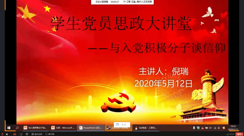 2020年5月12日,土木与港海工程学院第二期学生党员思政大讲堂通过QQ在线课堂的形式如期举行。此次大讲堂的主题是“与入党积极分子谈信仰”,主讲人为工管172班班长、中共预备党员倪瑞同学,工管支部全体入党积极分子参加聆听。