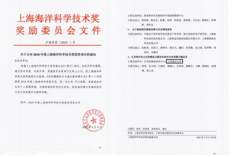 该奖为大海区海洋奖,参评单位主要来自上海市、江苏、浙江和福建省的海洋科研院所。经过层层评选,我校科研团队研究的“江苏省海洋动力过程模拟及缓发性海洋灾害预警关键技术”科研成果,获得“2019年上海海洋科学技术奖二等奖”。此次获奖是业界对我校科研团队在海洋科学技术领域取得的成绩给予的肯定。