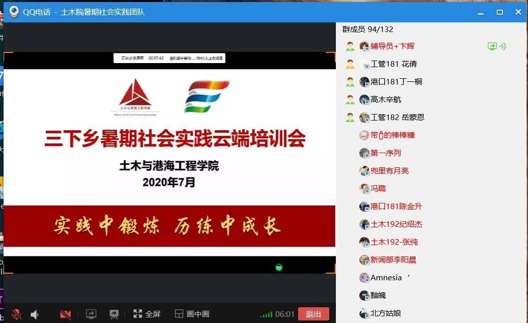 2020年7月16日晚九点,土木与港海工程学院通过QQ群分享屏幕开展了2三下乡暑期社会实践云端培训会。本次培训会有幸邀请到了校十佳大学生申旋旋同学作为主讲人,土木学院团学组织各学生干部、大一大二各班级团干部以及有意聆听的同学参加了此次培训会。会议由院团委副书记卞辉老师主持。