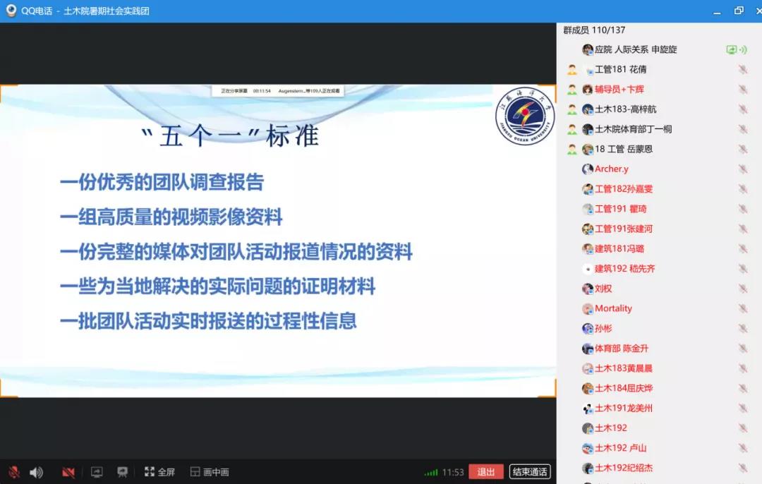 紧接着,申旋旋从暑期社会实践上交材料的角度给大家做了进一步的介绍与分享。她提出了暑期社会实践的“五个一”标准:一份优秀的团队调查报告,一个高质量的视频资料,一个完整的媒体对团队活动报导的资料,解决当地实际问题的材料证明,一批团队活动实施过程性信息。对于每一个标准,她都给予了相应的解释和举例说明,条理清晰,重点明确,线上的同学纷纷为其点赞。