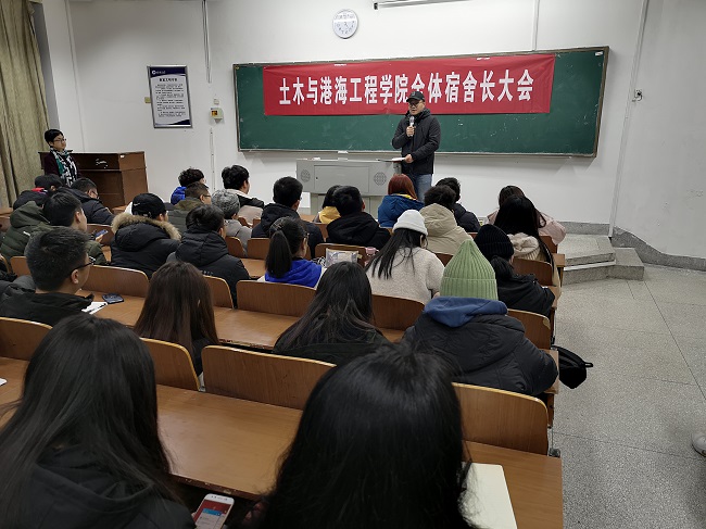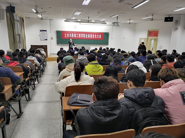 为进一步做好安全教育工作,夯实校园安全根基,筑牢学生安全堤坝,织密宿舍安全网络,保障学习生活有序开展,助力学生健康成长,土木与港海工程学院于12月2日下午在主楼312召开全体宿舍长安全教育大会。学院党委副书记钱汉珍,辅导员郭利、唐毅、樊洁阳、卞辉与200多名宿舍长共同参加会议。