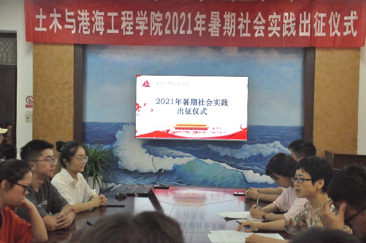 2021年7月12日,土木与港海工程学院大学生暑期社会实践出征仪式在土木楼会议室举行,学院党委副书记钱汉珍,辅导员樊洁阳、黄媛以及参加暑期社会实践的80余名学生代表参加了仪式。