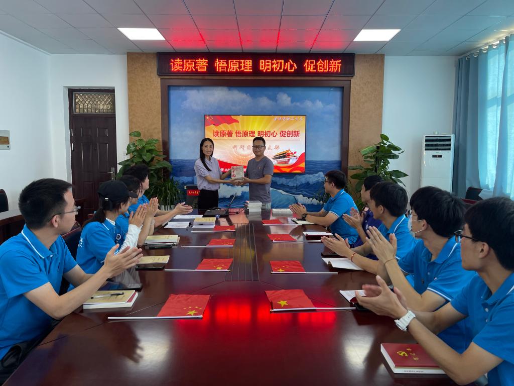 王改红代表学院为科研团队党支部成员赠书,希望全体党员能够学深悟透,常新常学、常思常悟,紧密结合实际,大胆创新,践行初心使命,以昂扬的斗志迎接党的二十大胜利召开。