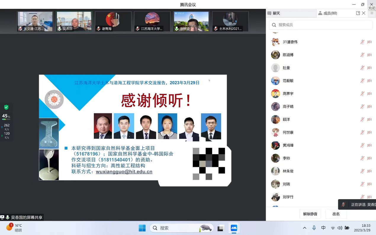 3月29日下午,应土木与港海工程学院的邀请,哈尔滨工业大学土木工程学院吴香国教授进行了题为“超高性能混凝土结构研究进展”的线上学术报告。学院各系负责人、青年博士和研究生聆听了报告,副院长朱文谨主持报告会。
