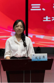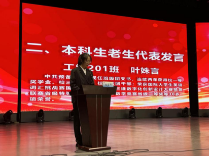 随后,工程管理专业201班叶姝言同学作为本科生老生代表发言。她倡议新同学们要努力奋斗,奋斗是青春亮丽的底色。大学应该在奋斗中度过,在老师的指导下、团队的协作下,驰骋竞赛的沙场,斩获耀眼的佳绩,努力成为大学生活中的“C位”。