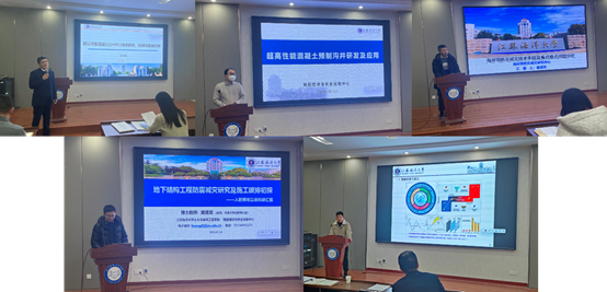 院长宗钟凌作了《超高性能混凝土(UHPC)技术研究、应用及创新发展》的学术报告,详细介绍了超高性能混凝土(UHPC)技术研究及UHPC在大型桥梁、高铁站、风电塔筒和隧道等工程上的应用,并提出了UHPC在绿色生态可持续发展、电力工程、空心与薄壁式结构和海洋工程装配式浮体等创新发展方向。青年博士谢青海、董啸天、黄德龙和侯风分别作了《超高性能混凝土预制沟井研发及应用》、《海岸带防灾减灾技术手段及重点难点问题分析》、《地下结构工程防震减灾研究及施工碳排初探》和《相变储能组合墙体储热机理与承载性能协同优化研究》的学术报告。