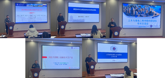 学院科研团队负责人朱文谨、蔡小宁、顾炳伟、田安国和蒋德稳就各自团队的研究进展与研究内容进行了介绍。详细介绍科研团队在海岸带防灾减灾、预应力装配式结构、固废资源绿色资源化利用、装配式混凝土创新技术和工程结构鉴定与加固等方向的研究进展。