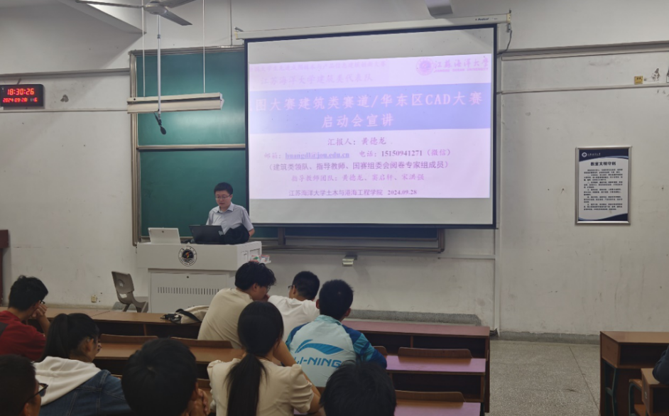 2024年9月28日,第十八届全国大学生先进成图技术与产品信息建模创新大赛及第十五届华东区大学生CAD应用技能大赛(土木建筑类)宣讲启动会在文通楼C124教室召开。会议以线上和线下结合的方式同时进行。来自土木与港海工程学院、机械工程学院、海洋与测绘学院等100余名同学、成图大赛(建筑、道桥、水利)三个类别指导教师黄德龙、骆辉、苏腾、窦启轩和宋洪强参与了本次启动会讲座,土木与港海工程学院党委书记王改红也莅临了讲座现场。