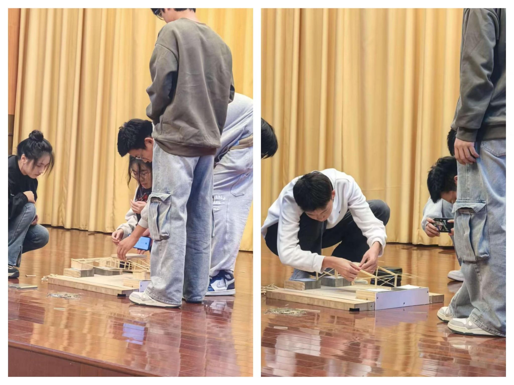 大赛共历经近3个小时,加载环节引发现场阵阵欢呼。其中冠军作品最为出色,是一个23.18克的木结构桁架,它巧妙地利用加载板的自身强度提高了模型的承重能力,获得了93.67的高分。最终,通过现场加载、评委打分,共评选出一等奖作品6件、二等奖作品12件、三等奖作品24件。土木与港海工程学院付立旺组摘得本届大赛桂冠,张家豪组获得亚军。