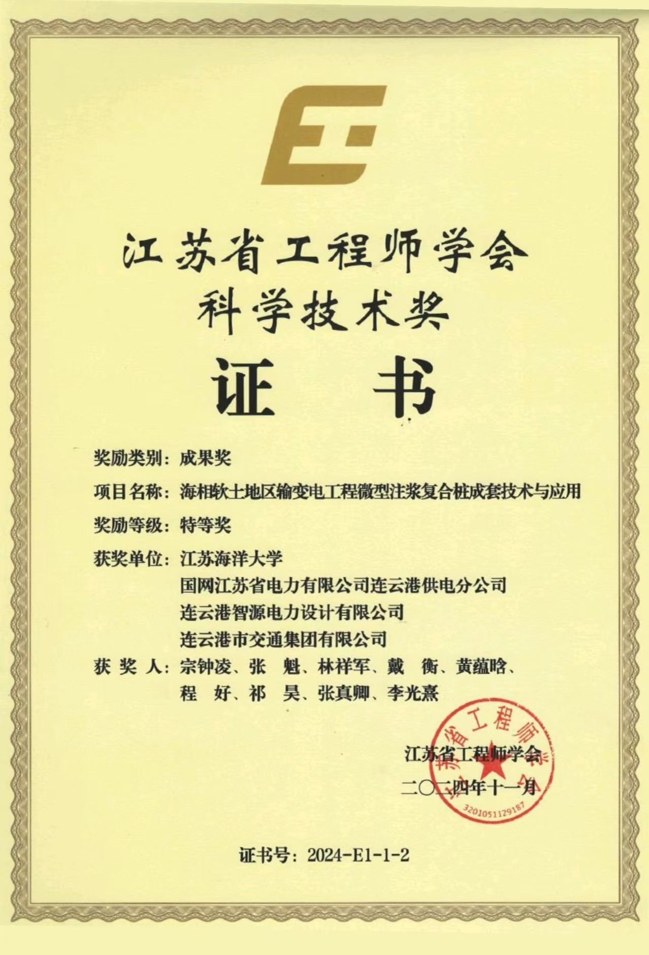 江苏海洋大学联合国网连云港供电公司、连云港智源电力设计有限公司和连云港市交通集团有限公司共同研究的海相软土地区输变电工程基础施工技术,在2024年江苏省工程师学会科学技术奖中荣获特等奖。此次获奖成果由我校土木与港海工程学院的宗钟凌教授与相关团队共同完成,“十年磨一桩”并成功推广应用。