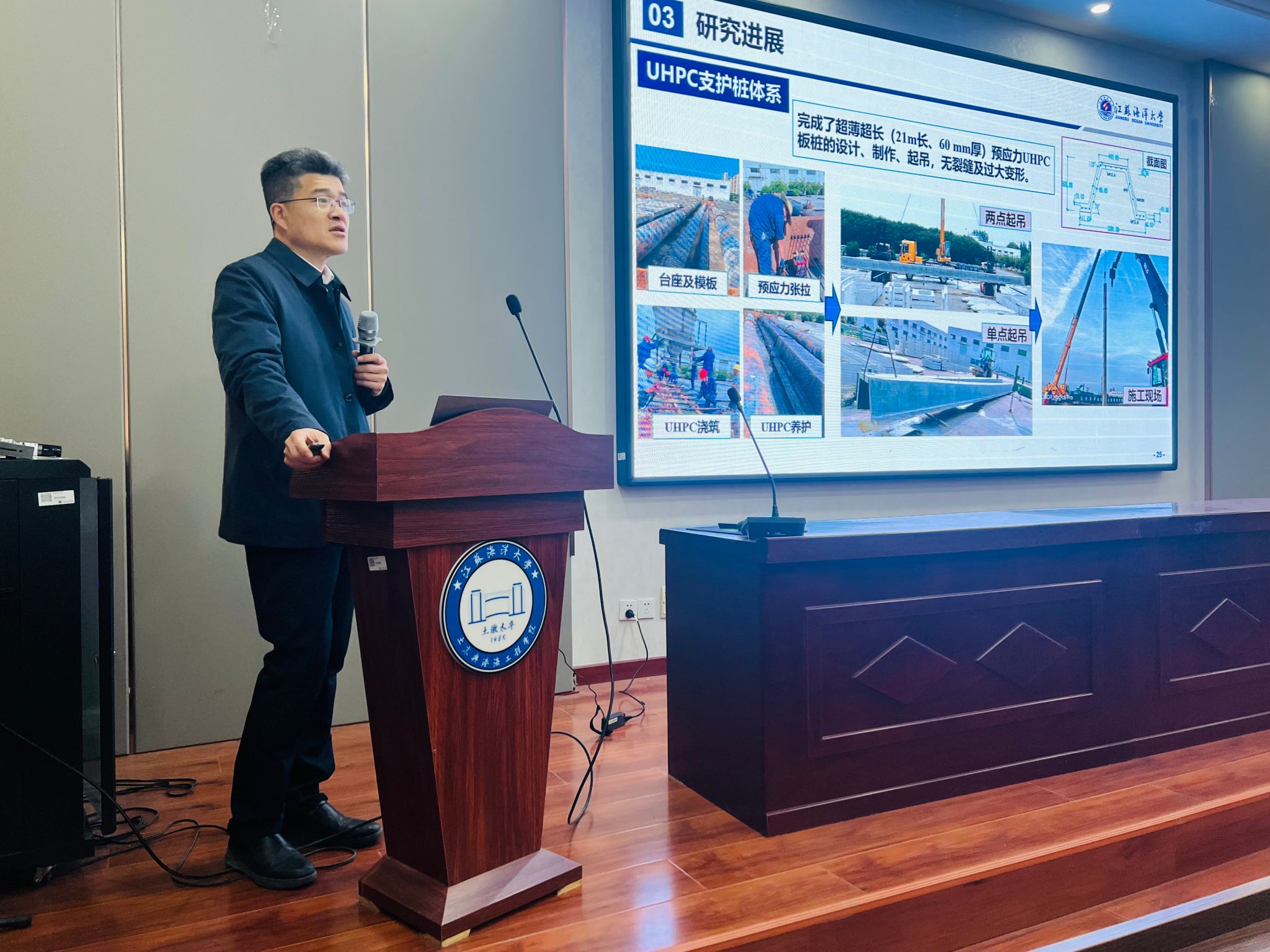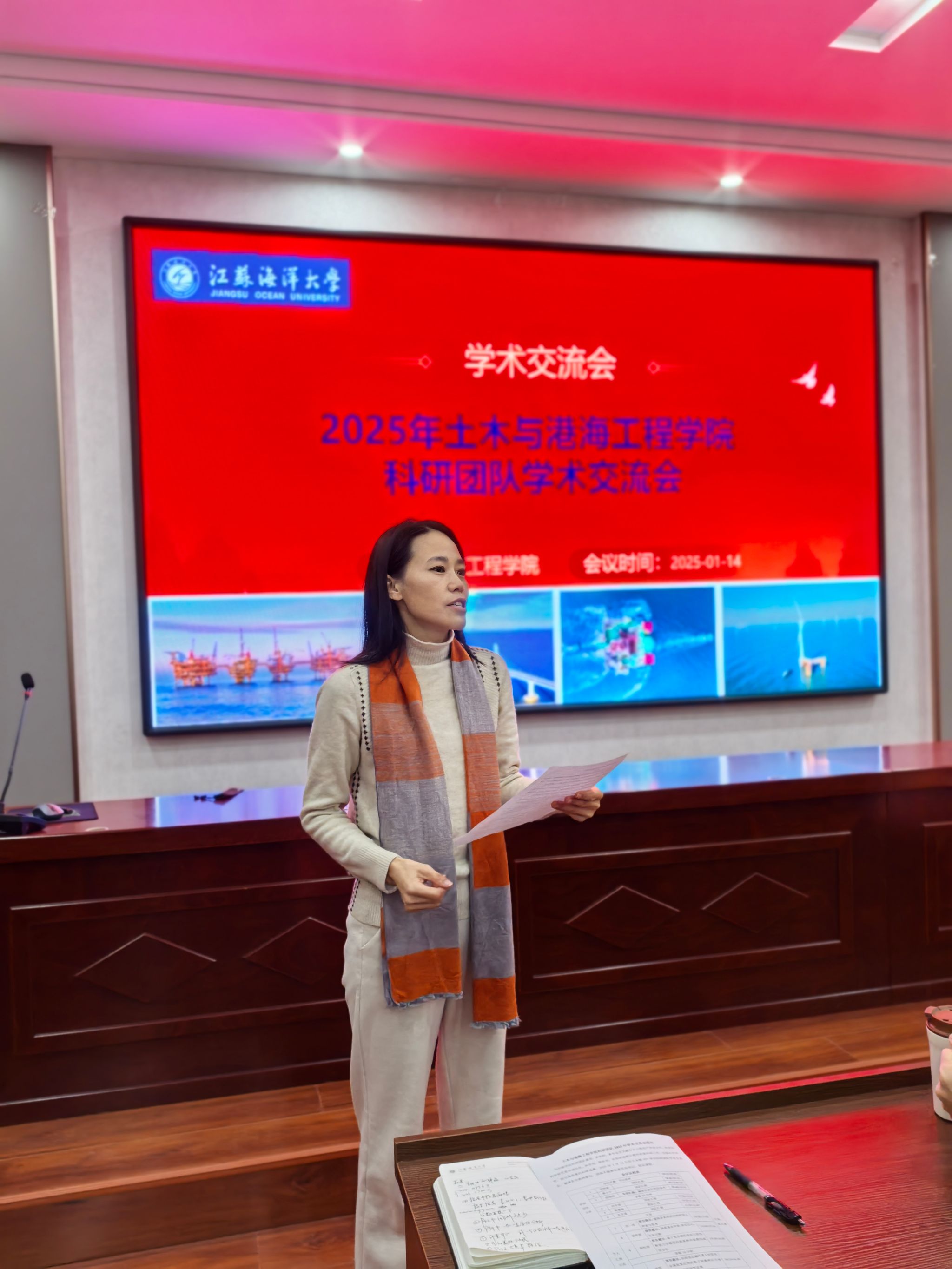 在汇报环节,宗钟凌、朱文谨、蔡小宁、赵晓晴、田安国、蒋德稳等团队负责人,分别就各自团队在海洋工程基础设施建造、海岸带防灾减灾、预应力装配式结构、固废资源绿色资源化利用、装配式混凝土创新技术、工程结构鉴定与加固等研究方向的进展,进行了全面介绍。他们详细阐述了团队的研究目标、方法、成果以及未来发展规划。谢青海、骆辉、薛松领、宗梦繁、范一鸣等5位青年博士相继带来了精彩的学术报告,分享了在各自研究领域的前沿成果与宝贵经验,报告内容详实、视角独特,充分彰显了青年教师在科研工作中的蓬勃活力与巨大潜力,为学院科研发展注入了全新动力。