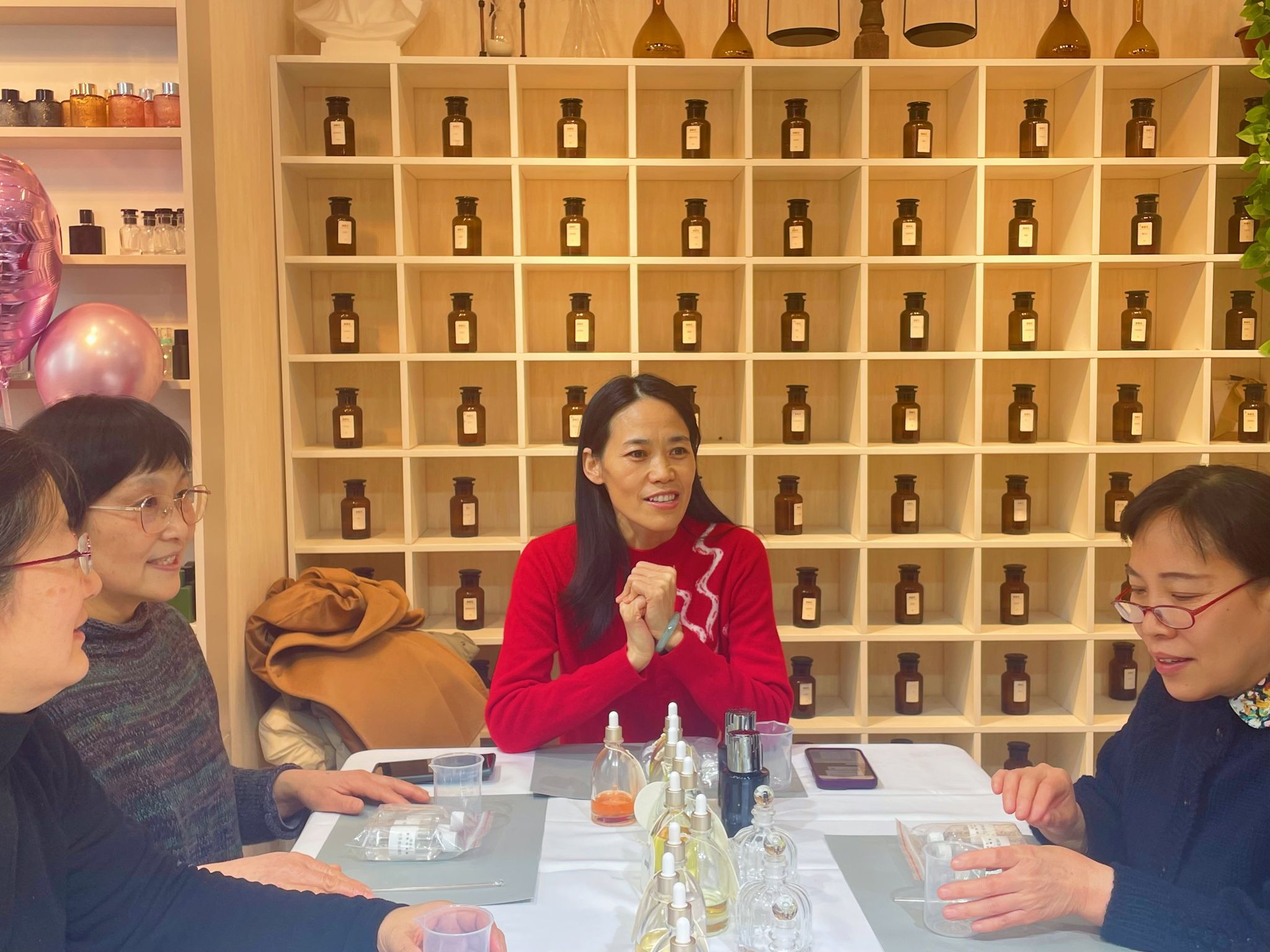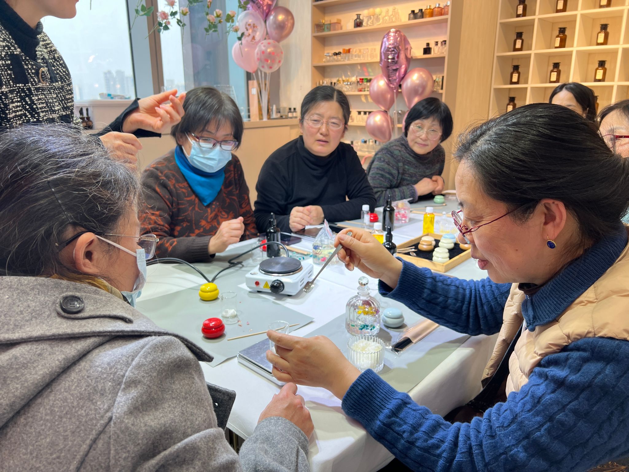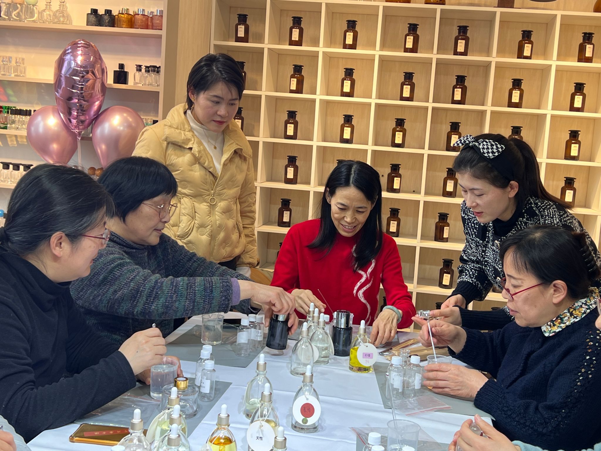 活动中,老师们褪去日常教学科研的忙碌,化身“调香师”沉浸于手作时光。在专业老师指导下,大家细致称量香料、调配精油比例,将严谨的科研习惯融入香氛创作——有人精准记录配比数据,笑称“职业病改不了”;有人大胆尝试混合薰衣草与柑橘香调,创作出个性作品。孙虹老师手持自制香膏感慨:“原来制香也能结合科学与艺术,这体验像回到实验室,却又充满诗意。”
