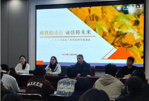 为提升学生的感恩意识和培养诚信品质,助力学生全面成长成才,2025年12月10日下午,土木与港海工程学院在土木南楼207会议室举办了主题为“感恩励志行,诚信铸未来”的师生座谈会。学院党委书记王改红、党委副书记魏学庆,辅导员马超、李旭丰出席了会议,全体奖助学金获得者参与了此次座谈。