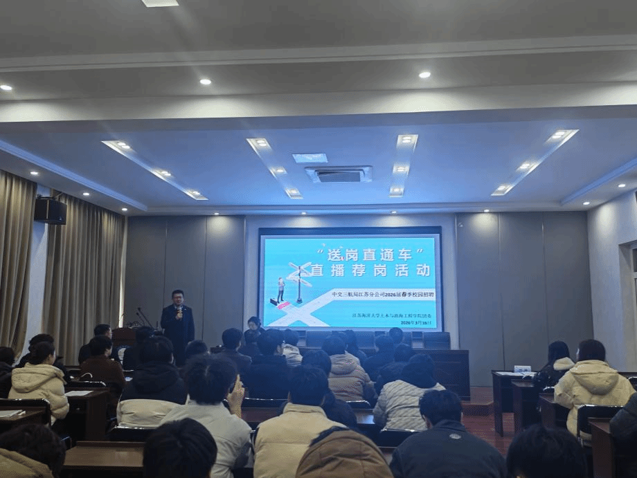 为深化校企合作,搭建优质就业平台,助力2026届毕业生精准就业,土木与港海工程学院与中交三航局江苏分公司联合开展校园招聘宣讲活动,为学子们带来了一场高质量的就业对接盛宴。学院党委书记王改红、副书记魏学庆,中交三航局江苏分公司党委副书记刘祺及公司其他主要负责人出席招聘会
