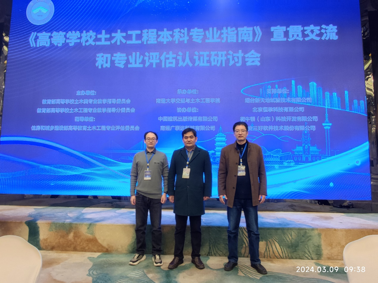 为进一步完善土木工程专业本科人才培养方案,3月9日—10日,土木与港海工程学院副院长蔡小宁、系主任李青松与系副主任谢青海一行参加了在南通大学召开的《高等学校土木工程本科专业指南》宣贯交流和专业评估认证研讨会。会议由教育部高等学校土木类专业教学指导委员会、教育部高等学校土木工程专业教学指导分委员会主办,南通大学交通与土木工程学院承办。