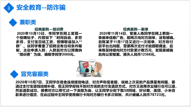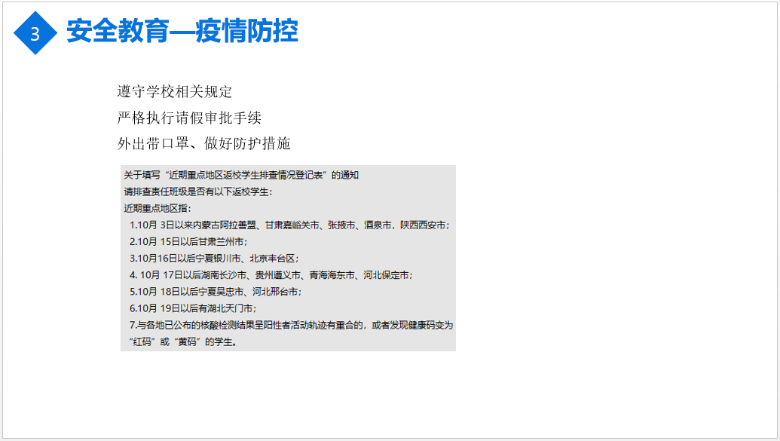 为提高新生疫情期间的防护意识、安全防范意识和防诈骗本领,黄媛自暑假起就在新生qq群内强调疫情防控和防诈骗相关知识,开展防疫知识宣传和防疫指导,提醒学生要熟练掌握个人防护与消毒等基本知识和技能。在此次入学教育上,黄媛继续开展网络安全和防诈骗教育,向研究生展示经典案例。并且再次强调疫情反复,所有人都要保持警惕,一直做好防护措施,遵守疫情防控规定。