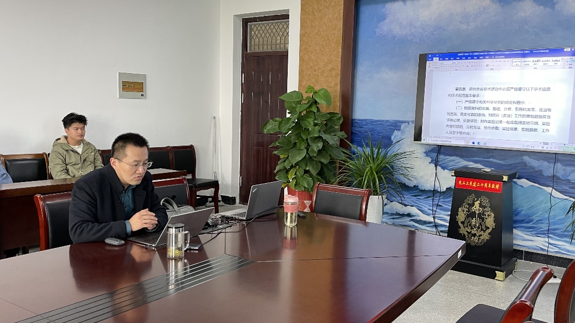 首先由朱文谨给研究生进行科学道德与学术规范教育、专业教育。他带领研究生一起逐条阅读《江苏海洋大学研究生学术道德和学术规范管理办法》里的各项要求,对其中的重点要求进行分析和强调,并以近几年发生的研究生违反学术道德规范事件来警醒在座的学生。随后解读文件《江苏海洋大学研究生科学与实践创新计划管理办法》,结合本专业培养方案及学位授予要求,对不同年级的研究生提出了不同的要求,希望所有人能充分利用三年的时间,培养科研能力、创新能力、实践能力,毕业的时候交上一份满意的答卷。