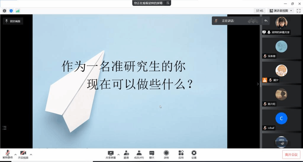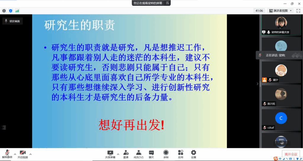 最后,研究生辅导员卞辉老师就大家所关心的入党和评奖评优等方面的问题进行了讲解,并告诫大家一定要提早确定学习目标、及早做好人生规划,努力让自己的研究生生活过得充实而有意义。准研究生们也就自己关心的问题,与学长学姐们在线上开展了广泛的交流。