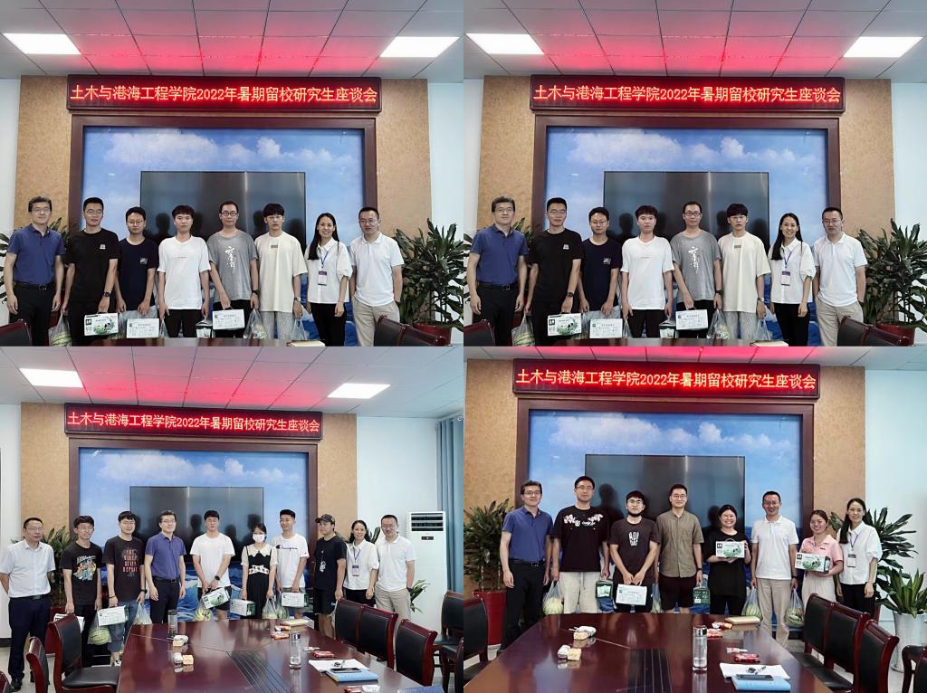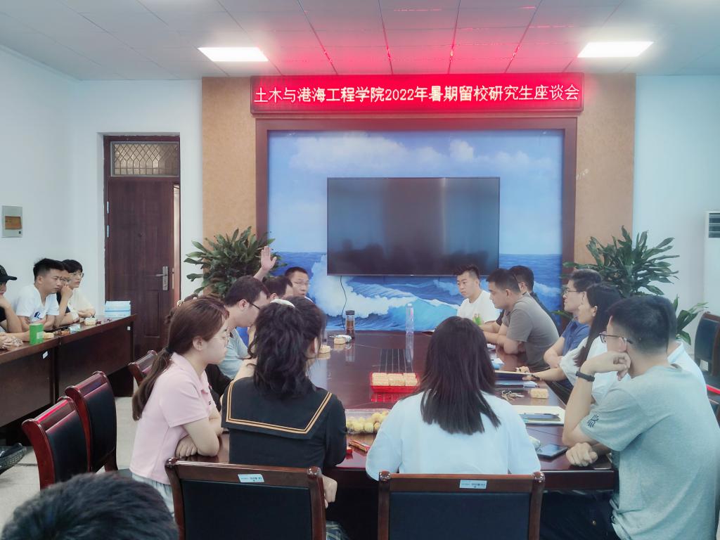 7月15日上午,土木与港海工程学院2022年暑期留校研究生座谈会在土木楼302会议室召开。院党委书记王改红,院长宗钟凌,副院长朱文谨、蔡小宁,导师代表蒋德稳、武江传,各位辅导员以及学院全体留校研究生参加座谈会。