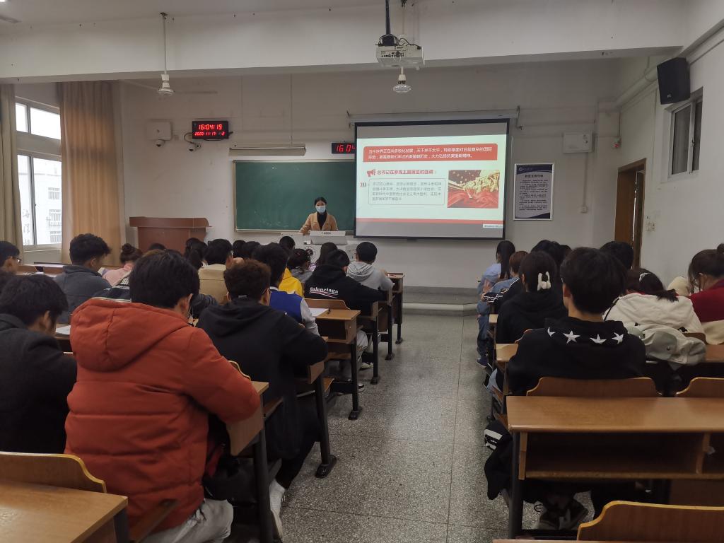 接下来,卞辉老师从国内外形势、履行青年职责、聚焦重点任务三个方面给大家做详细讲解。全体同学带着满腔的敬意去认真听讲、积极发言讨论,卞辉老师的激情讲解也让党课的内容深入人心,让同学们再一次回忆了志愿军烈士的牺牲和贡献精神,再一次认识到今天的和平是如何得来之不易!无形之中,大大增强了同学们的爱国热情以及对于投身祖国伟大事业的决心。