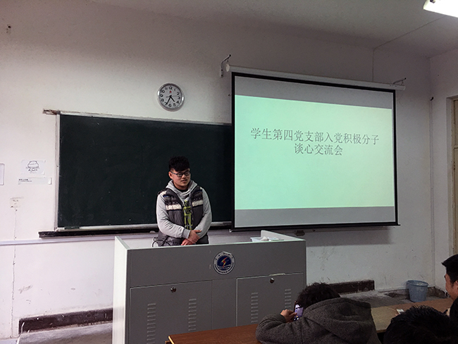 首先,樊老师对学生党员发展要求、发展程序及本支部的组织建设作简要介绍,并要求每位积极分子对自身的入党动机、对党的认识以及提交入党志愿书以来的思想表现等方面向党组织作汇报。随后,入党积极分子进行自由交流,相互交流,相互学习。