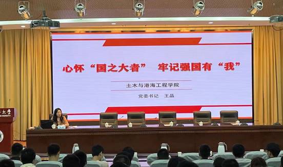 2021年10月10日上午,土木与港海工程学院党委书记王晶以“心怀‘国之大者’,牢记强国有‘我’”为题,为全体2021级本科和研究生新生讲授开学思政第一课。