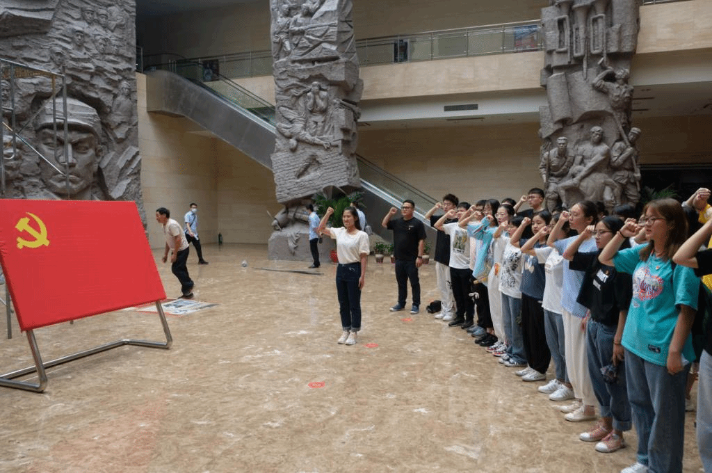 革命烈士纪念馆序厅内,樊洁阳老师教育全体党员要用党员的高标准严格要求自己,学史明理、学史增信、学史崇德、学史力行,在党史学习教育中充实自己的思想,做一名合格的中共党员。在岳蒙恩同志的领誓下,全体党员面对鲜红的中国共产党党旗,举起右拳,重温入党誓词。铿锵有力的宣誓声响彻大厅。樊老师勉励大家要永远牢记入党誓词,坚定理想信念,勇担时代重任,充分发挥先锋模范作用,永远忠诚于党和人民。