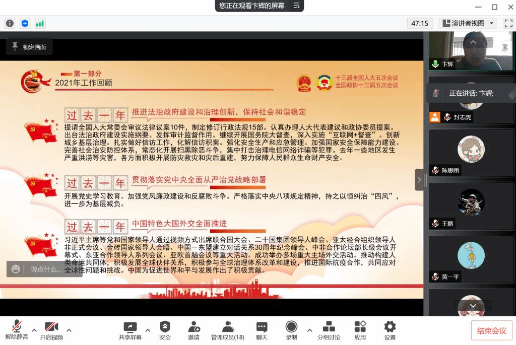 首先,卞老师带领同学们回顾了2021年政府工作内容,2021年面对复杂严峻的国内外形势和诸多风险挑战,全国上下共同努力,统筹疫情防控和经济社会发展,全年主要目标任务较好完成,“十四五”实现良好开局,我国发展取得新的重大成就。经济保持恢复发展,国家创新能力进一步增强,经济结构和区域布局继续优化,不断深化改革开放,生态文明建设持续推进,人民生活水平稳步提高,疫情防控成果持续巩固。