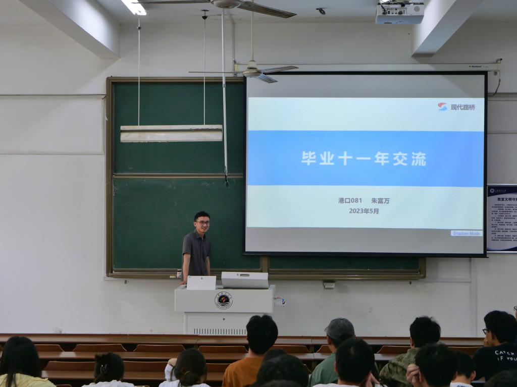 校友沙龙分享会,由港航系主任成小飞老师主持。靳闯、朱富万、秦骁波、卢志巍等4名优秀校友与学弟学妹们分享了毕业后个人学习和工作经历,对职业发展进行了心得分享与建议。他们鼓励学弟学妹们好好学习专业知识,多看看外面的大千世界,要有走出舒适圈、突破自我的勇气。