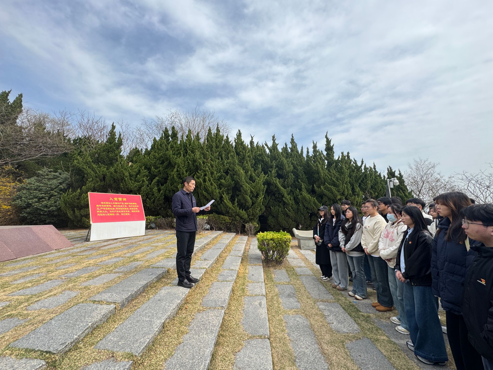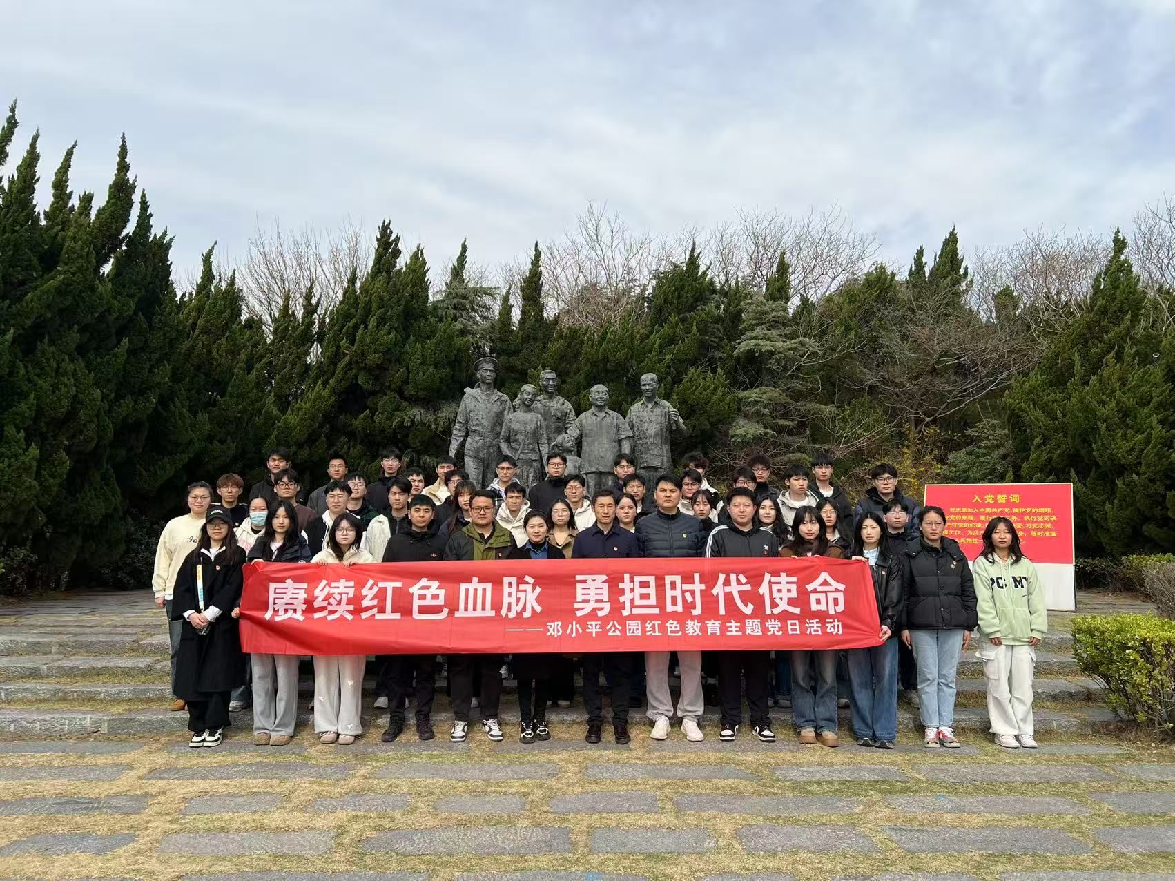 清明春雨润心田,赓续血脉勇担当。为全面贯彻党的二十大和二十届二中、三中全会精神,强化党团组织凝聚力,同时增强学生党员和团学干部的理想信念,激发学生骨干投身新时代建设的责任感。3月29日上午,土木与港海工程学院党委副书记魏学庆带领三个学生党支部师生党员,及部分团学组织骨干,赴连云港市邓小平公园开展以“赓续红色血脉,勇担时代使命”主题党日活动。