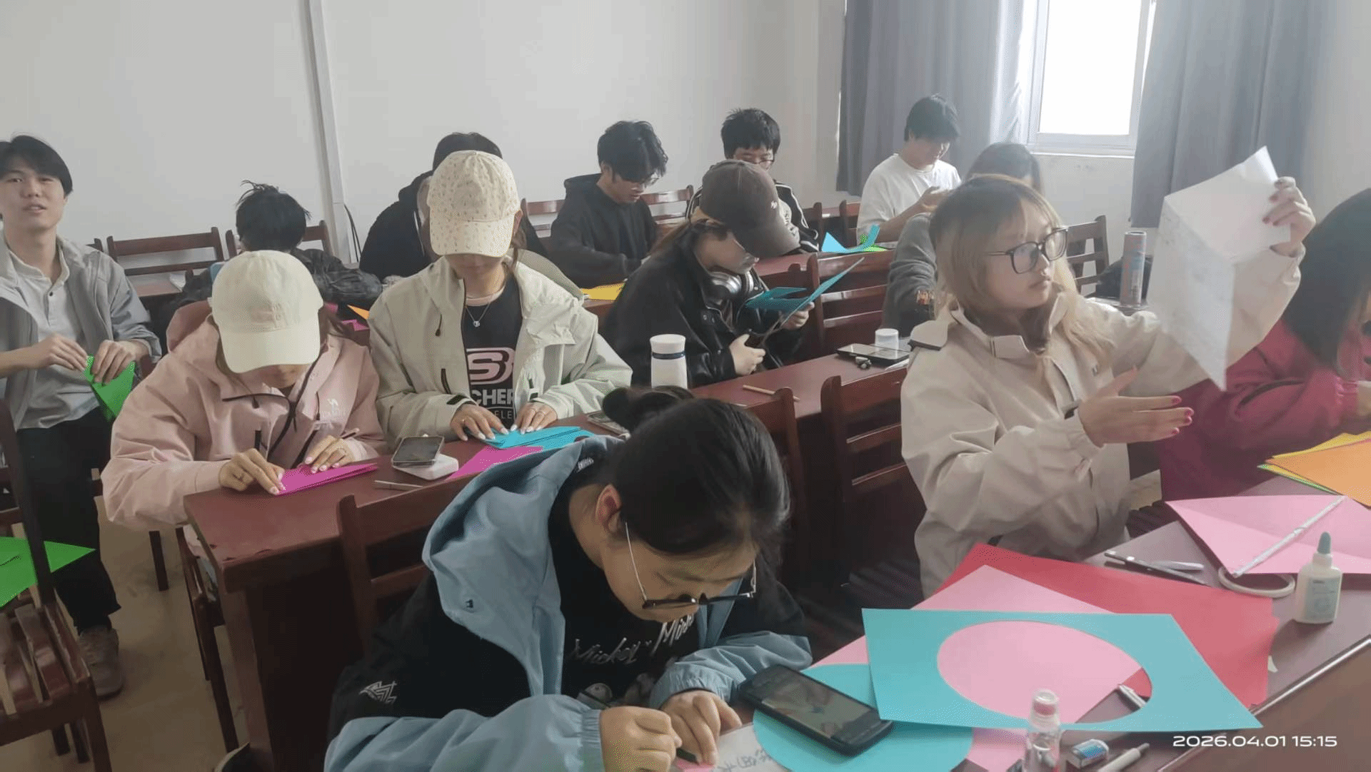 环保卡纸、彩色画笔、剪刀胶水……志愿者们分工协作,有的细致裁剪风筝骨架,有的用画笔勾勒童趣图案——憨态可掬的小熊、色彩斑斓的彩虹、展翅的蝴蝶,每一笔都凝聚着巧思;“愿你像风筝一样,自由翱翔”“勇敢做自己,我们都在”等温暖寄语,则被一笔一划写在风筝两翼。现场笑语不断,卡纸的沙沙声与画笔的摩擦声交织,构成一曲充满爱的春日交响。
