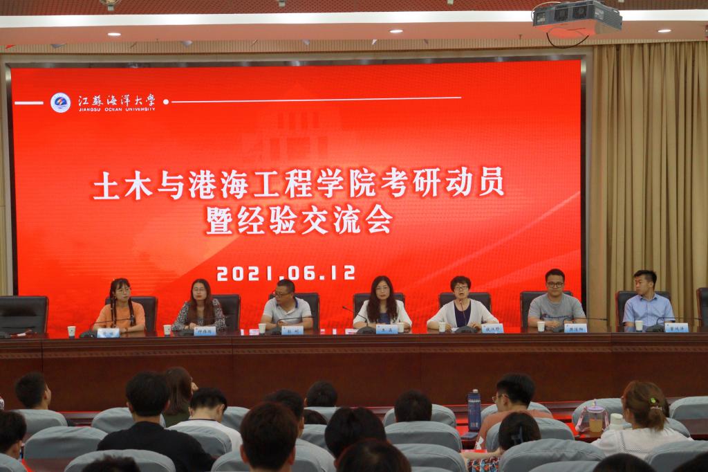 2021年6月12日晚,土木与港海工程学院考研动员暨经验交流会在黄海厅举行。学院党委书记王晶、副书记钱汉珍、全体辅导员、已考取研究生代表、即将考研和准备考研同学共200余人参加了会议,会议由钱汉珍主持。