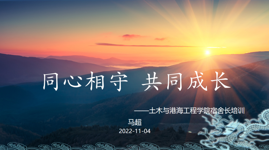 为进一步筑牢学生抗疫“心”防线,提高学院宿舍长工作能力与素养,充分发挥宿舍长在心理健康教育工作中的重要作用,11月4日晚,土木与港海工程学院在线上开展了主题为“同心相守,共同成长”的心理知识培训会,本次线上培训由学院心理辅导员马超老师讲授,学院全体宿舍长参与了此次培训。