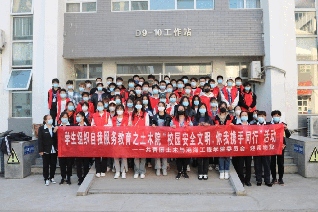 大学生寝室是大学校园文化的窗口,寝室集体作为大学生基本群体组织相对于其他学生组织有着独特的功能和影响。寝室成员长期的共同生活影响着每个成员的生活方式、学习态度、行为规范、价值理念和理想信念,形成独特的寝室文化。为深入推进文明宿舍创建活动常态化,促进大学生文明素质养成,塑造健康向上的宿舍文化氛围,10月19日下午3点,土木院团委宣传部于江苏海洋大学D区与迎宾物业共同开展“校园安全文明,你我携手同行”劳动实践活动。本次活动的意义是:有序体现校园安全之美。