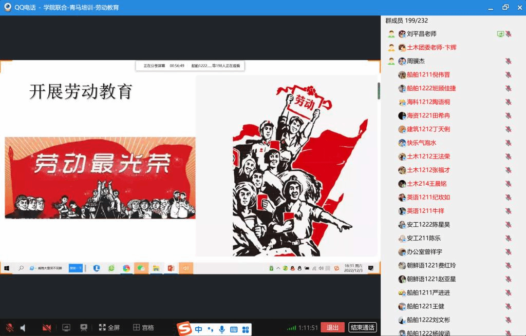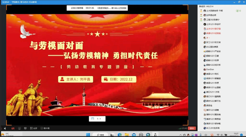 本次讲座,刘教授主要从“什么是劳模精神”“共和国劳模示范”和“新时代大学生如何践行劳模精神”三个方面展开。他强调,劳模精神、劳动精神和工匠精神都是新时代需要大力弘扬的精神,劳模精神具有重大的时代意义同时也是二十大报告强调的重要内容。此外,同学们在刘教授的带领下一起学习了众多典型的劳模事迹,受益匪浅,感受颇深,其中包括“杂交水稻之父”袁隆平,守卫孤岛整整32年的“王继才”,我校校友、“新时代”造纸设备维修技术能手范燚。之后,刘教授借用习近平总书记的话语,殷切希望我们大学生能做到“学”“思”“践”“悟”劳模精神,积极组织和参加劳动教育相关活动,培养责任担当,养成劳动好习惯,用自己的实际行动诠释和践行劳模精神。最后,刘教授呼吁全体青马学员都能向劳模学习,成为新时代的领跑者。