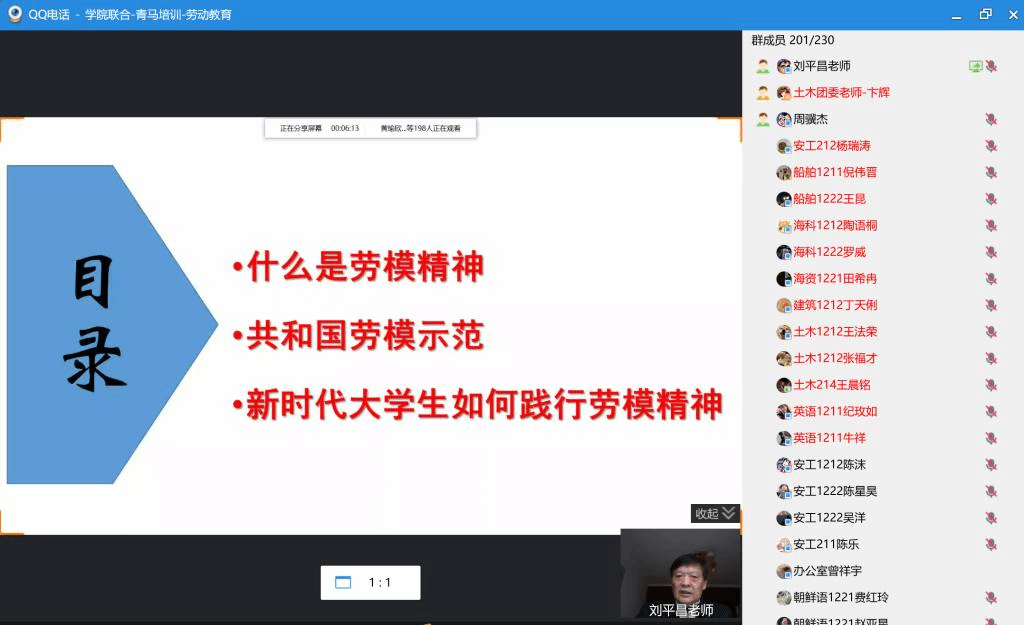 为深入贯彻习近平总书记在全国劳动模范和先进工作表彰大会上的讲话精神,增强同学们的责任感、使命感,焕发劳动热情,12月3日下午,我院与海洋科学与水产学院、外国语学院、环境与化工学院、海洋工程学院共同举办了“与劳模面对面——弘扬劳模精神,勇担时代责任”劳动教育专题讲座。本次讲座邀请了江苏海洋大学教学督导组组长刘平昌教授主讲,五个学院的青马工程培训班全体学员参加,讲座由土木与港海工程学院团委书记卞辉老师主持。