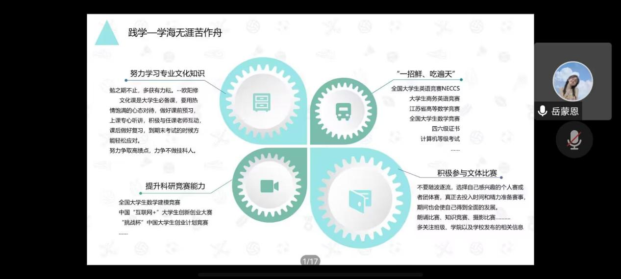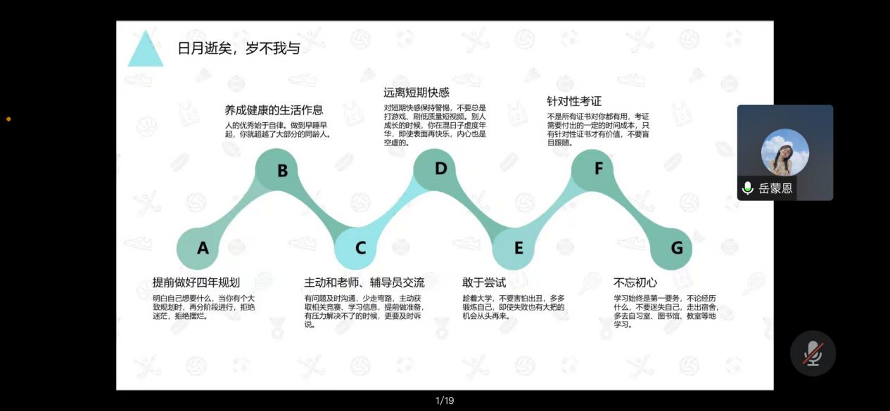 为帮助土木学院的莘莘学子更好地适应大学生活,让同学们更加深入地理解“不负当下,未来可期”的真正内涵,2022年11月27日晚7点,土木与港海工程学院通过腾讯会议开展了名校优生“云”会面活动。本次“云”会面活动邀请了工管182的优秀毕业生、目前在河南大学读研的岳蒙恩学姐。