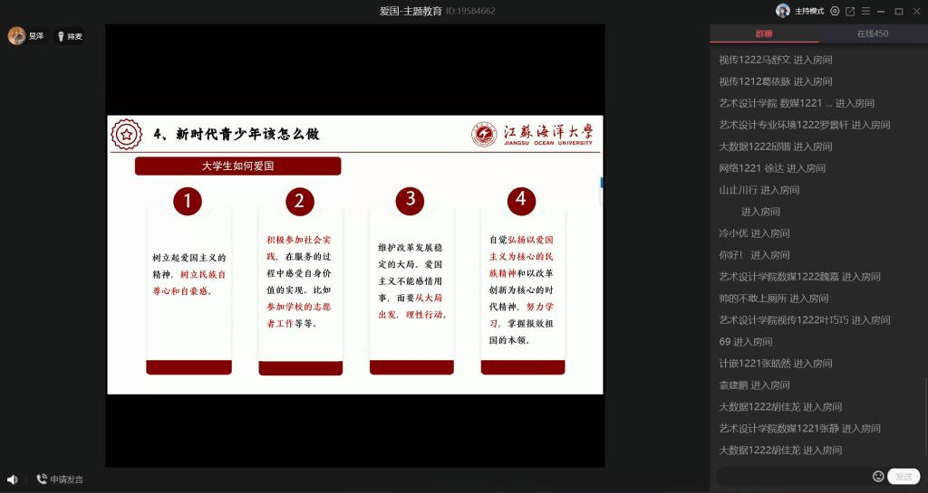 为进一步加强爱国主义教育,弘扬爱国主义精神,增强爱国主义情感,树立民族自尊心和自信心,2022年12月23日19点,校团委郭戈老师在线上召开了爱国主题教育讲座,参加本次讲座的有土木与港海工程学院、环境与化学工程学院以及艺术设计学院的部分学生骨干和青年团员。