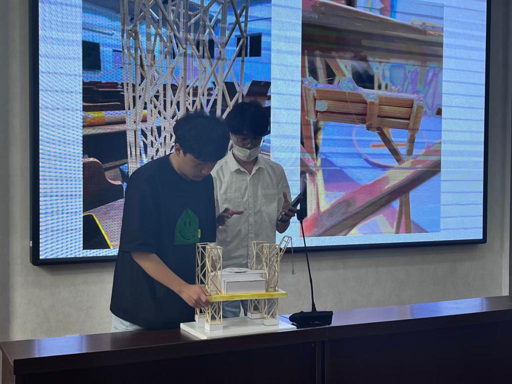 大赛流程上,评委们通过成员汇报、评委提问、现场答辩等环节对参赛作品进行评分。各个参赛队伍对自己作品的建筑力学概念、结构概念、创新思维等多方位进行阐述,力求全面展现自己的设计成果。评委们根据作品的观赏及实用价值,从节能减排、循环经济等多角度进行考量,经过讨论与评分,最终评选出一等奖2项、二等奖4项、三等奖12项。