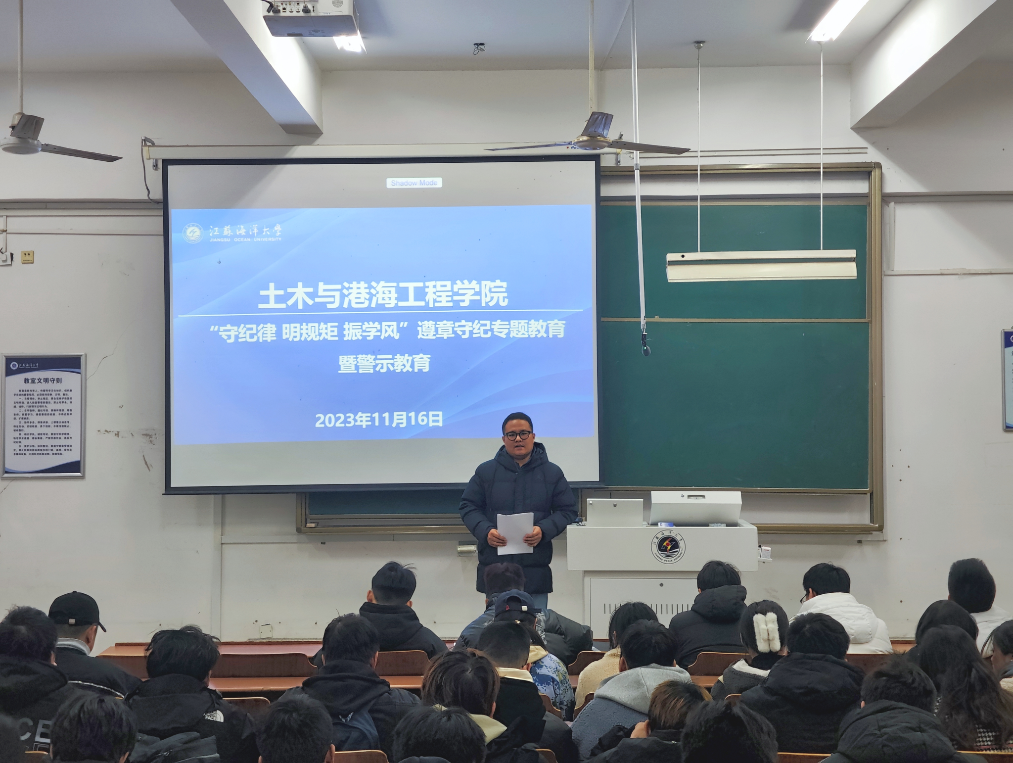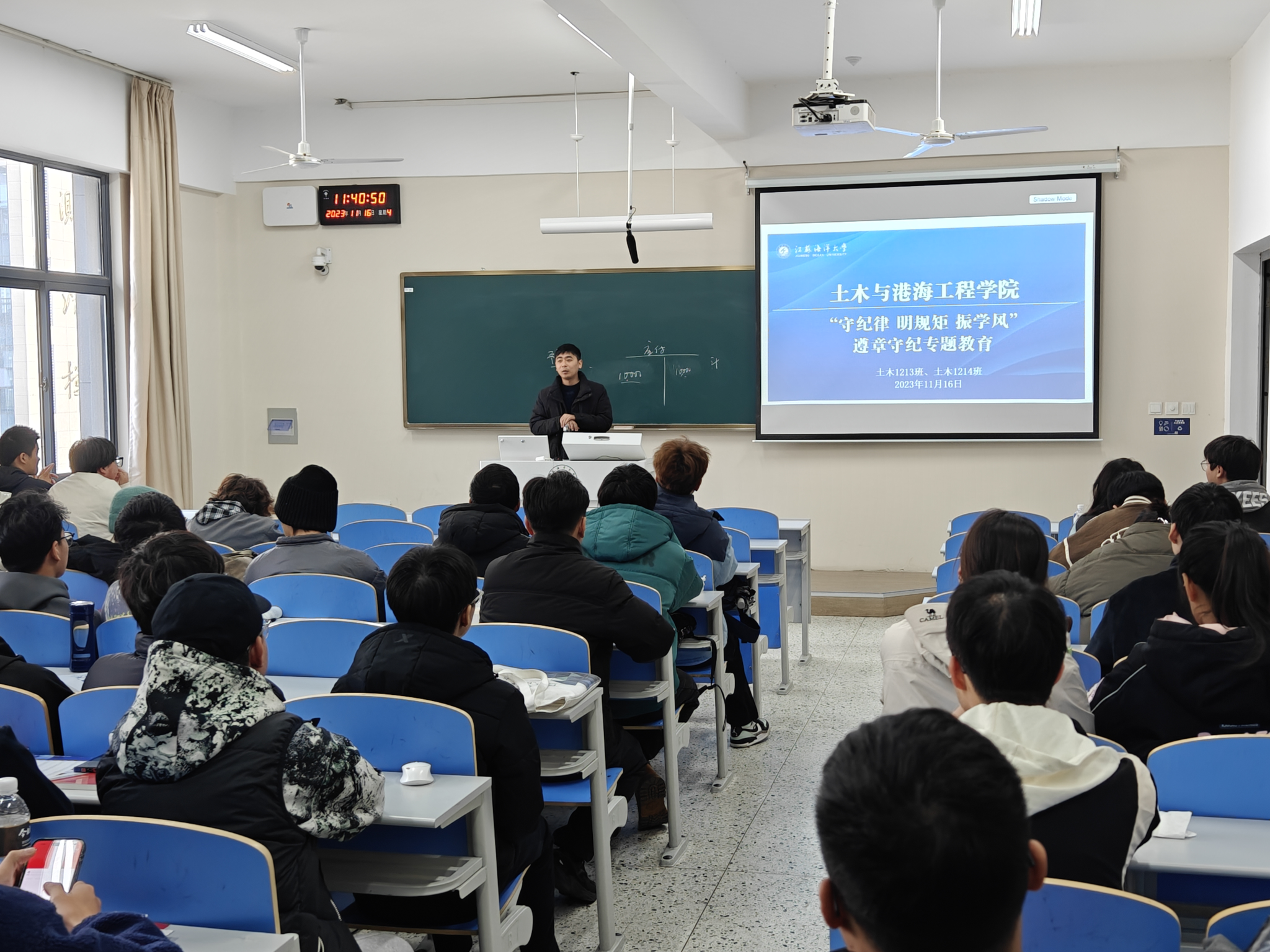 为积极培育和践行社会主义核心价值观,教育引导全体学生自觉遵守法律法规以及学校各项规章制度,警惕苗头性、倾向性、隐蔽性问题,强化风险排查,改善育人环境,推动学风建设,11月15日-11月20日,土木与港海工程学院面向学院全体本科生、研究生43个班级开展2023-2024学年“守纪律明规矩振学风”遵章守纪专题活动暨警示教育。